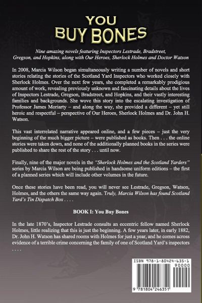 Nine amazing novels featuring Inspectors Lestrade, Bradstreet, Gregson, and Hopkins, along with Our Heroes, Sherlock Holmes and Doctor Watson In 2008, Marcia Wilson began simultaneously writing a number of novels and short stories relating the stories of the Scotland Yard Inspectors who worked closely with Sherlock Holmes. Over the next few years, she completed a remarkably prodigious amount of work, revealing previously unknown and fascinating details about the lives of Inspectors Lestrade, Gregson, Bradstreet, and Hopkins, and their vastly interesting families and backgrounds. She wove this story into the escalating investigation of Professor James Moriarty - and along the way, she provided a different - yet still heroic and respectful - perspective of Our Heroes, Sherlock Holmes and Dr. John H. Watson. This vast interrelated narrative appeared online, and a few pieces - just the very beginning of the much bigger picture - were published as books. Then . . . the online stories were taken down, and none of the additionally planned books in the series were published to share the rest of the story . . . until now. Finally, nine of the major novels in the "Sherlock Holmes and the Scotland Yarders" series by Marcia Wilson are being published in handsome uniform editions - the first of a planned series which will include other volumes in the future. Once these stories have been read, you will never see Lestrade, Gregson, Watson, Holmes, and the others the same way again. Truly, Marcia Wilson has found Scotland Yard's Tin Dispatch Box... BOOK I: You Buy Bones In the late 1870's, Inspector Lestrade consults an eccentric fellow named Sherlock Holmes, little realizing that this is just the beginning. A few years later, in early 1882, Dr. John H. Watson has shared rooms with Holmes for just a year, and he comes across evidence of a terrible crime concerning the family of one of Scotland Yard's inspectors