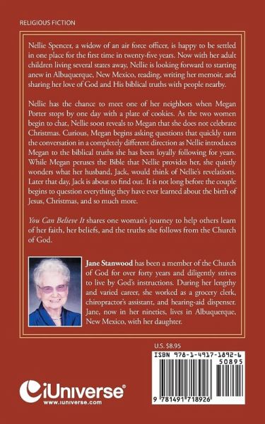 Nellie Spencer, a widow of an air force officer, is happy to be settled in one place for the first time in twenty-five years. Now with her adult children living several states away, Nellie is looking forward to starting anew in Albuquerque, New Mexico, reading, writing her memoir, and sharing her love of God and His biblical truths with people nearby. Nellie has the chance to meet one of her neighbors when Megan Porter stops by one day with a plate of cookies. As the two women begin to chat, Nellie soon reveals to Megan that she does not celebrate Christmas. Curious, Megan begins asking questions that quickly turn the conversation in a completely different direction as Nellie introduces Megan to the biblical truths she has been loyally following for years. While Megan peruses the Bible that Nellie provides her, she quietly wonders what her husband, Jack, would think of Nellie's revelations. Later that day, Jack is about to find out. It is not long before the couple begins to question everything they have ever learned about the birth of Jesus, Christmas, and so much more. You Can Believe It shares one woman's journey to help others learn of her faith, her beliefs, and the truths she follows from the Church of God.