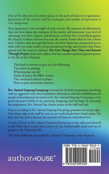 One of the obstacles the enemy places in the path of believers is ignorance. Ignorance of the enemy and his strategies and modes of operation is very dangerous. Your ignorance is the strength of your enemy; the amount of information that you have about the strategies of the enemy will determine your level of advantage over him. Satanic and demonic activities have intensified against the church in these end time because the enemy knows that he has a short time. I believe that through this book, the Holy Spirit has empowered me to share with you some wealth of experiential knowledge and research that I have gained over the yours in ministry. You Can Change Your Time and Seasons Through Prayers deals with subject that has ceaseless spiritual ignition power in the life of the Christian. This book is written to give you the following: The power in praying What praying can do? Kinds of prayer the Bible teaches The command related to prayer How to pray and receive answers Rev. Samuel Sarpong Frempong is known for his bold compassion, preaching with an aggressive style that emphasizes deliverance and the establishment of people in foundational doctrinal truth. Rev. Samuel Sarpong Frempong, a very good education holder in art, painting, designing, and theology. In executing his assignment, Rev. Samuel has chosen prayer as his staff and rod. Prayer, according to Rev. Samuel Sarpong Frempong, possesses two sharp edges. One sharp edge is the staff he uses to save individuals from Satans grips. He then uses the rod to destroy the activities of Satan in individual lives. A man of God, as Rev. Samuel Sarpong Frempong is, has subjected himself to the Holy Spirit to give him lessons on the indispensable need and use of prayer in the Christians life. The Holy Spirit has also made Rev. Samuel F. Sarpong a man of prayer.