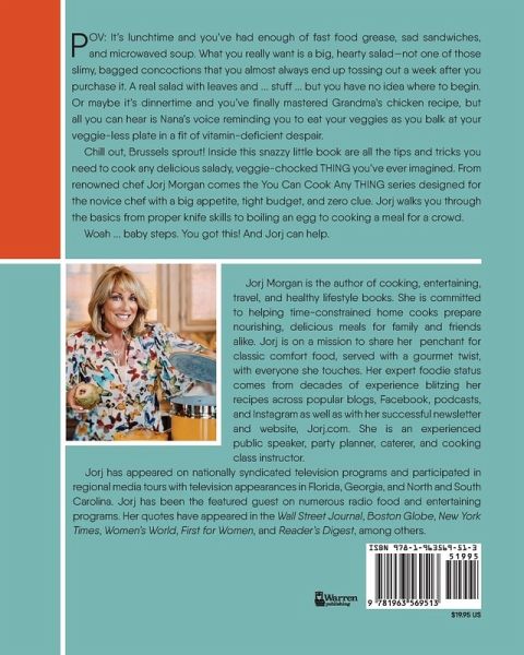 POV: It's lunchtime and you've had enough of fast food grease, sad sandwiches, and microwaved soup. What you really want is a big, hearty salad-not one of those slimy, bagged concoctions that you almost always end up tossing out a week after you purchase it. A real salad with leaves and ... stuff ... but you have no idea where to begin. Or maybe it's dinnertime and you've finally mastered Grandma's chicken recipe, but all you can hear is Nana's voice reminding you to eat your veggies as you balk at your veggie-less plate in a fit of vitamin-deficient despair. Chill out, Brussels sprout! Inside this snazzy little book are all the tips and tricks you need to cook any delicious salady, veggie-chocked THING you've ever imagined. From renowned chef Jorj Morgan comes the You Can Cook Any THING series designed for the novice chef with a big appetite, tight budget, and zero clue. Jorj walks you through the basics from proper knife skills to boiling an egg to cooking a meal for a crowd. Woah ... baby steps. You got this! And Jorj can help.