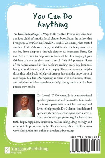 You Can Do Anything: 12 Ways to Be the Best Person You Can Be is a unique children's motivational chapter book. From the author that brought you You Can Do This, Dr. Lowell T. Coleman, Jr has created another children's book to help your children be the best person they can be. From chapter 1 through chapter 12, characters Rena, Kia and Kell are back to help kids understand 12 life changing topics children can use on their own to reach their full potential. Some of the topics covered in this book are reading every day, kindness, being a good listener, and being happy. There are several examples throughout this book to help children understand the importance of each topic. You Can Do Anything is filled with definitions, stories, and mind-stimulating questions to help young readers be the best person they can be.