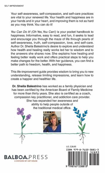 Your self-awareness, self-compassion, and self-care practices are vital to your renewed life. Your health and happiness are in your hands and in your heart, and improving them is not as hard as you may think. You can do it! You Can Do It! (Oh Yes, You Can!) is your pocket handbook to happiness. Informative, easy to read, and fun, it seeks to lead and encourage you through the maze of life through pearls of self-awareness, truth, self-compassion, love, and self-care. Author Dr. Sheila Balestrino's desire to explore and understand how health and healing really works led her to wisdom and to the answers she shares now. She explains how healing and feeling better really work and offers practical steps to help you make changes for the better. With her guidance, you can find a better path to freedom, health, and happiness. This self-improvement guide provides wisdom to bring you to new understanding, release limiting impressions, and learn how to create a happier and healthier life.