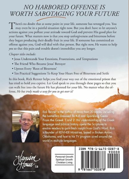 No Harbored Offense Is Worth Sabotaging Your Future There's no doubt that at some point in your life, someone has wronged you. You may even be in a painful situation right now. But you don't have to let anyone's actions against you pollute your attitude toward God and prevent His good plan for your future. What matters now is that you stop unforgiveness and bitterness before they began producing their deadly fruit in your life. If someone has committed an offense against you, God will deal with that person. But right now, He wants to help you so that this pain and trouble doesn't immobilize you any longer. Chapter titles include: Jesus Understands Your Emotions, Frustrations, and Temptations The Friend Who Became Jesus' Betrayer Uproot Every 'Root of Bitterness' Ten Practical Suggestions To Keep Your Heart Free of Bitterness and Strife In this book, Rick Renner helps you find your way out of the emotional prison that has tried to hold you captive. Let God speak to you through these pages so that you can walk free into the future He has planned for your life. No matter what the offense, He has truly made a way for you to get over it!