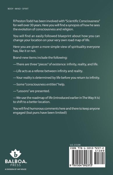 You will find an easily followed blueprint about how you can change your location on your very own road map of life. Here you are given a more simple view of spirituality everyone has, like it or not. Brand-new items include the following: There are three pieces of existence: infinity, reality, and life. Life acts as a referee between infinity and reality. Your reality is determined by life before you return to infinity. Some consciousness entities help. Lessons are presented. We use the roadmap of life (introduced earlier in The Way It Is) to shift to a better location. You will find humorous comments here and there to keep anyone engaged.