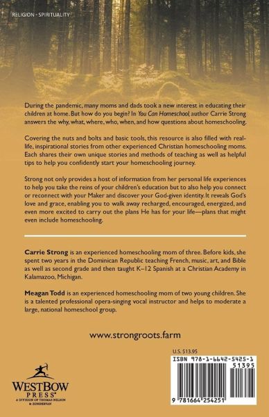 During the pandemic, many moms and dads took a new interest in educating their children at home. But how do you begin? In You Can Homeschool, author Carrie Strong answers the why, what, where, who, when, and how questions about homeschooling. Covering the nuts and bolts and basic tools, this resource is also filled with real-life, inspirational stories from other experienced Christian homeschooling moms. Each shares their own unique stories and methods of teaching as well as helpful tips to help you confidently start your homeschooling journey. Strong not only provides a host of information from her personal life experiences to help you take the reins of your children's education but to also help you connect or reconnect with your Maker and discover your God-given identity. It reveals God's love and grace, enabling you to walk away recharged, encouraged, energized, and even more excited to carry out the plans He has for your life-plans that might even include homeschooling.