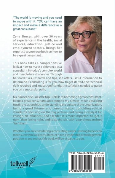 "The world is moving and you need to move with it. YOU can have an impact and make a difference as a great consultant!" Zena Simces, with over 30 years of experience in the health, social services, education, justice and employment sectors, brings her expertise to a unique book on how to be a great consultant. This book takes a comprehensive look at how to make a difference as a consultant in today's complex world and meet future challenges. Through her narratives, research and tips, she offers useful information to determine if consulting is for you, how to get started, the technical skills required and, most significantly, the soft skills needed to guide you on a successful path. Ms. Simces discusses the top 10 skills to becoming a great consultant. Being a great consultant, according to Ms. Simces, means building trusting relationships, understanding the culture of the organization, being a good listener and communicator, upholding ethical standards, focusing on the big picture, and being a catalyst for change, an influencer, and a leader. It is more important to "get it right" than "being right," and to do the job "with" your clients and not "for" them. Whether you are considering a consulting career, wishing to be even more successful as a consultant, or have a leadership or management position in any sector, this book will be of value to you.