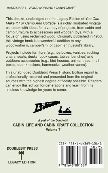 A classic pamphlet on making woodworking crafts and projects from reclaimed wood for the cabin, cottage, or campsite! This deluxe unabridged reprint Legacy Edition of You Can Make It For Camp And Cottage, Part II of the classic You Can Make It series, is a richly illustrated vintage planbook with ideas for a variety of projects, from cabin and camp furniture to accessories and wooden toys, with a particular focus on how to reclaim wood. Originally published in 1930 by the U.S. Department of Commerce's National Committee on Wood Utilization, this vintage book is a wonderful addition to any woodworker's, camper's, or cabin enthusiast's library. This little pamphlet is packed with a huge number of projects of all kinds, with an eye toward the rustic, cabin-craft feel. Projects include furniture such as ice boxes, showers, vanities, rocking chairs, linen closets, desks, bookcases, chairs, tables, benches, stools, trunks and boxes, kitchen accessories, small cabinets, and racks. Also included are outdoor accessories for your rustic site, such as bird houses, animal traps, toy boats, mail boxes, door knockers, hammocks, folding outdoor tables, weather vanes, bean bag and dart targets, sawbucks, and fishing tackle boxes. Enjoy the dozens of woodworking projects in this tightly packed book! This vintage book includes rich illustrations on a variety of camp and cabin woodworking projects that would go great in any rustic setting. Although this book represents thought from a former time, it also reveals much about the rich history of the woodworking tradition, and many of the tips, tricks, and designs are still relevant for today! A part of the Doublebit Cabin Life and Cabin Craft Collection: Volume 7 This Doublebit Legacy Edition reprint of You Can Make It For Camp And Cottage is professionally restored and presented from the original source, including inspiration from the book's original cover, with the highest degree of fidelity possible. Readers can enjoy this Legacy Edition for generations to come and learn from its timeless knowledge. About the Doublebit Press Legacy Editions Sometimes we need to remember our history to move forward. Sometimes, remembering our heritage is just fun or inspirational. With technology playing a major role in everyday life, sometimes we need to take a step back in time to find those basic building blocks used for gaining mastery - the things that we have luckily not completely lost and has been recorded in books over the last two centuries. These skills aren't forgotten, they've just been shelved. It's time to unshelve them once again and reclaim the lost knowledge of self-sufficiency! As a part of the Doublebit Press Legacy Edition Collection, this unabridged volume is reprinted in the exact form as it was presented in the original publication. Both important and minor details have equally both been accounted for by our publishing staff, down to the cover, font, layout, and images. It is the goal of Doublebit Legacy Edition series to preserve outdoors heritage, but also be cherished as collectible pieces, worthy of collection in any handcrafter's or outdoorsperson's library and that can be passed to future generations.