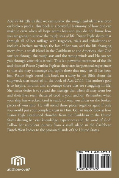Acts 27:44 tells us that we can survive the rough, turbulent seas even on broken pieces. This book is a powerful testimony of how one can make it even when all hope seems loss and you do not know how you are going to survive the rough seas of life. Pastor Fogle shares that through all of her suffrage with tragedies, trials and tribulations to include a broken marriage, the loss of her son, and the life changing move from a small island in the Caribbean to the Americas, that God saw her through the rough seas and the strong winds and He can see you through your trials as well. This is a powerful testament of the life and times of Pastor Cynthia Fogle as she shares her personal experiences so that she may encourage and uplift those that may feel all has been lost. Pastor Fogle based this book on a story in the Bible about the shipwreck that occurred in the book of Acts 27:44. The author's goal is to inspire, inform, and encourage those that are struggling in life. She wants desire is to spread the message that when all may seem lost and their lives seem shattered God is your anchor. Remember when your ship has wrecked, God is ready to keep you afloat on the broken pieces of your ship. He will mend those pieces together again if only you would put your complete trust in Him. Get an inside look at how Pastor Fogle established churches from the Caribbean to the United States sharing her vast knowledge, experiences and the word of God. Follow her turbulent journey from a small island in the Caribbean Dutch West Indies to the promised lands of the United States.