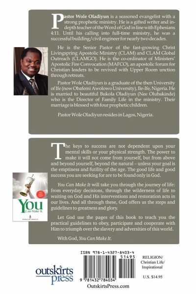 The Keys to success are not dependent on your mental skills or your physical strength. The power to make it will not come from yourself, but from above and beyond you, beyond the natural-unless your goal is the emptiness and futility of the age.The good life and good success you are seeking for are to be found only in God. You Can Make It will take you through the journey of life: from everyday decisions, through the wilderness of life to waiting on God and His interventions and restoration acts in our lives. And all through these, God offers us the steps and guidelines to greatness and glory. Let God use the pages of this book to teach you the practical guidelines to obey, participate and cooperate with Him to triumph over the slavery and adversities of this world. With God, You Can Make It.