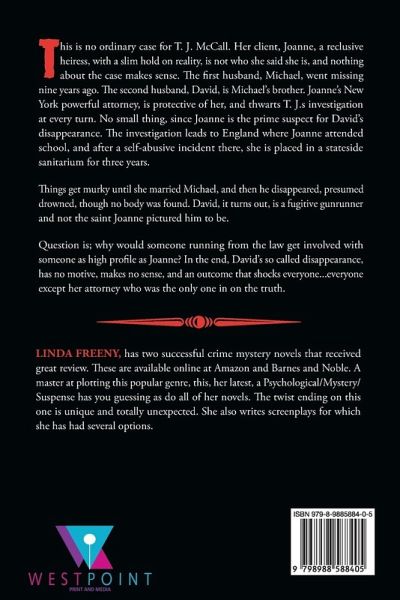 This is no ordinary case for T. J. McCall. Her client, Joanne, a reclusive heiress, with a slim hold on reality, is not who she said she is, and nothing about the case makes sense. Th e first husband, Michael, went missing nine years ago. Th e second husband, David, is Michael's brother. Joanne's New York powerful attorney, is protective of her, and thwarts T. J.s investigation at every turn. No small thing, since Joanne is the prime suspect for David's disappearance. Th e investigation leads to England where Joanne attended school, and after a self-abusive incident there, she is placed in a stateside sanitarium for three years. Things get murky until she married Michael, and then he disappeared, presumed drowned, though no body was found. David, it turns out, is a fugitive gunrunner and not the saint Joanne pictured him to be. Question is; why would someone running from the law get involved with someone as high profile as Joanne? In the end, David's so called disappearance, has no motive, makes no sense, and an outcome that shocks everyone...everyone except her attorney who was the only one in on the truth. LINDA FREENY, has two successful crime mystery novels that received great review. Th ese are available online at Amazon and Barnes and Noble. A master at plotting this popular genre, this, her latest, a Psychological/Mystery/ Suspense has you guessing as do all of her novels. Th e twist ending on this one is unique and totally unexpected. She also writes screenplays for which she has had several options.