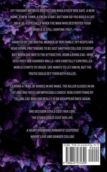 Ivy thought witness protection would keep her safe. A new name, a new town, a fresh start. But how do you build a life on a lie-especially when the man who destroyed your world is still hunting you? Haunted by the brutal murder of her family, Ivy keeps her head down, pretending to be just another college student. But when she meets the attractive, book-loving Zac-who sees past her guarded walls-her carefully controlled world starts to crack. She wants to let him in, but the truth could get them both killed. Leaving a trail of bodies in his wake, the killer closes in on Ivy and she faces an impossible choice: risk everything by telling Zac who she really is or disappear once again. One decision could cost her love. The other could cost her life. A heart-pounding romantic suspense where love and danger collide.
