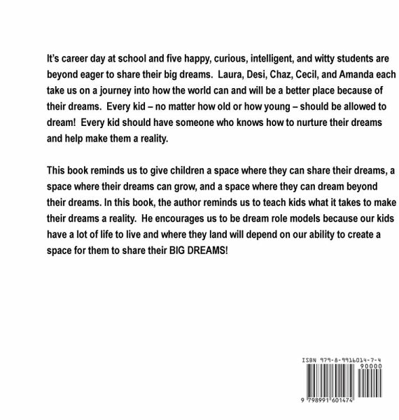 It's career day at school and five happy, curious, intelligent, and witty students are beyond eager to share their big dreams. Laura, Desi, Chaz, Cecil, and Amanda each take us on a journey into how the world can and will be a better place because of their dreams. Every kid - no matter how old or how young - should be allowed to dream! This book reminds us to give children a space where they can share their dreams, a space where their dreams can grow, and a space where they can dream beyond their dreams. In this book, the author reminds us to teach kids what it takes to make their dreams a reality. He encourages us to be dream role models because our kids have a lot of life to live and where they land will depend on our ability to create a space for them to share their BIG DREAMS!