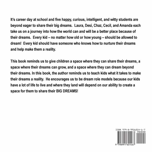 It's career day at school and five happy, curious, intelligent, and witty students are beyond eager to share their big dreams. Laura, Desi, Chaz, Cecil, and Amanda each take us on a journey into how the world can and will be a better place because of their dreams. Every kid - no matter how old or how young - should be allowed to dream! This books reminds us to give children a space where they can share their dreams, a space where their dreams can grow, and a space where they can dream beyond their dreams. In this book the author reminds us to teach kids what it takes to make their dreams a reality. He encourages us to be dream role models because our kids have a lot of life to live and where they land will depend on our ability to create a space for them to share their BIG DREAMS!