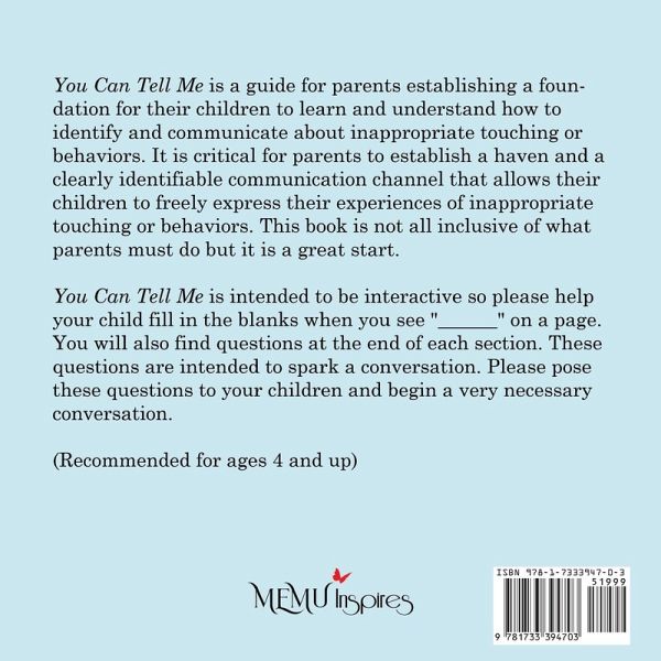 'You Can Tell Me' is a guide for parents establishing a foundation for their children to learn and understand how to identify and communicate about inappropriate touching or behaviors. It is critical for parents to establish a haven and a clearly identifiable communication channel that allows their children to freely express their experiences of inappropriate touching or behaviors. This book is not all inclusive of what parents must do but it is a great start. 'You Can Tell Me' is intended to be interactive so please help your child fill in the blanks when you see "_____________" on a page. You will also find questions at the end of each section. These questions are intended to spark a conversation. Please pose these questions to your children and begin a very necessary conversation. (Recommended for ages 4 and up.)