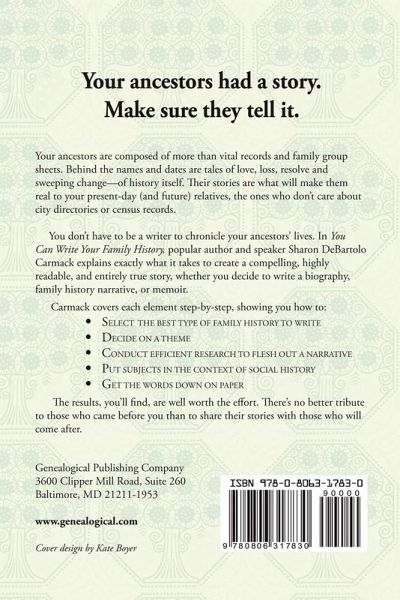 Your ancestors are composed of more than vital records and family group sheets. Behind the names and dates are tales of love, loss, resolve and sweeping change--of history itself. Their stories are what will make them real to your present-day (and future) relatives, the ones who don't care about city directories or census records. You don't have to be a writer to chronicle your ancestors' lives. In this volume, popular author and speaker Sharon DeBartolo Carmack explains exactly what it takes to create a compelling, highly readable, and entirely true story, whether you decide to write a biography, family history narrative, or memoir.