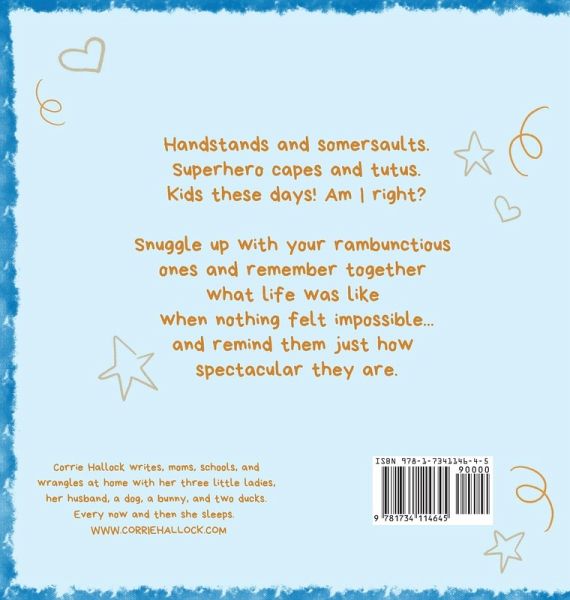 Celebrate adventure and imagination...but try to avoid trips to the ER. See through fresh eyes your child's God-given freedom and passion for life. Emphasize that the "cans" outweigh the "can'ts" in your home, as you welcome your child into the discovery of who they are. Laugh together at the crazy antics of these kids and their dog as they wreak havoc on the house and fully commit to the wonders of imagination.
