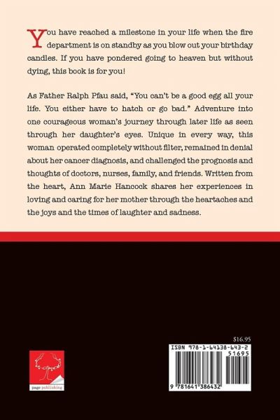 You have reached a milestone in your life when the fire department is on standby as you blow out your birthday candles. If you have pondered going to heaven but without dying, this book is for you! As Father Ralph Pfau said, "You can't be a good egg all your life. You either have to hatch or go bad." Adventure into one courageous woman's journey through later life as seen through her daughter's eyes. Unique in every way, this woman operated completely without filter, remained in denial about her cancer diagnosis, and challenged the prognosis and thoughts of doctors, nurses, family, and friends. Written from the heart, Ann Marie Hancock shares her experiences in loving and caring for her mother through the heartaches and the joys and the times of laughter and sadness.