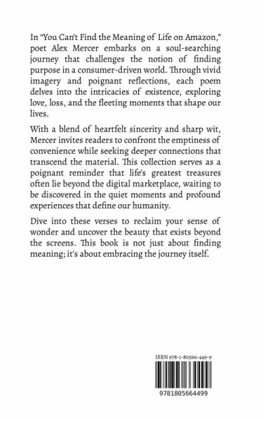 In "You Can't Find the Meaning of Life on Amazon," poet Alex Mercer embarks on a soul-searching journey that challenges the notion of finding purpose in a consumer-driven world. Through vivid imagery and poignant reflections, each poem delves into the intricacies of existence, exploring love, loss, and the fleeting moments that shape our lives. With a blend of heartfelt sincerity and sharp wit, Mercer invites readers to confront the emptiness of convenience while seeking deeper connections that transcend the material. This collection serves as a poignant reminder that life's greatest treasures often lie beyond the digital marketplace, waiting to be discovered in the quiet moments and profound experiences that define our humanity. Dive into these verses to reclaim your sense of wonder and uncover the beauty that exists beyond the screens. This book is not just about finding meaning; it's about embracing the journey itself.