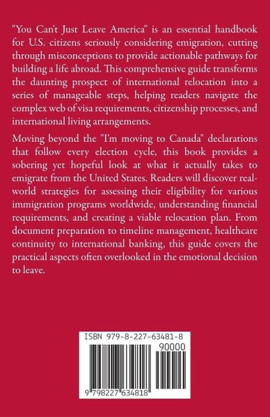 "You Can't Just Leave America" is an essential handbook for U.S. citizens seriously considering emigration, cutting through misconceptions to provide actionable pathways for building a life abroad. This comprehensive guide transforms the daunting prospect of international relocation into a series of manageable steps, helping readers navigate the complex web of visa requirements, citizenship processes, and international living arrangements. Moving beyond the "I'm moving to Canada" declarations that follow every election cycle, this book provides a sobering yet hopeful look at what it actually takes to emigrate from the United States. Readers will discover real-world strategies for assessing their eligibility for various immigration programs worldwide, understanding financial requirements, and creating a viable relocation plan. From document preparation to timeline management, healthcare continuity to international banking, this guide covers the practical aspects often overlooked in the emotional decision to leave. The book methodically breaks down the emigration process into achievable steps, examining popular destination countries, their immigration systems, and various pathways including work visas, retirement programs, digital nomad visas, and citizenship by investment opportunities. Special attention is given to crucial aspects like language requirements, cultural adaptation, professional networking abroad, and maintaining U.S. ties. Whether you're a professional seeking international opportunities, a retiree planning for overseas living, or a family considering a fresh start abroad, this guide provides the concrete information needed to make informed decisions and successful transitions. With detailed insights from immigration lawyers, relocation specialists, and real expatriate experiences, readers will gain a clear understanding of both the challenges and opportunities in building a new life overseas. The book includes practical tools such as document checklists, country comparison charts, and financial planning frameworks, making it an indispensable resource for anyone serious about leaving the United States for opportunities abroad. This book was created with a combination of human editorial oversight and AI-assisted writing tools.