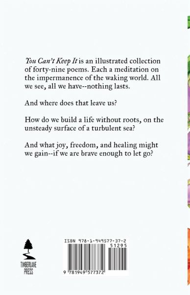 You Can't Keep It is an illustrated collection of forty-nine poems. Each a meditation on the impermanence of the waking world. All we see, all we have--nothing lasts. ¿ And where does that leave us? ¿ How do we build a life without roots, on the unsteady surface of a turbulent sea? ¿ And what joy, freedom, and healing might we gain--if we are brave enough to let go?