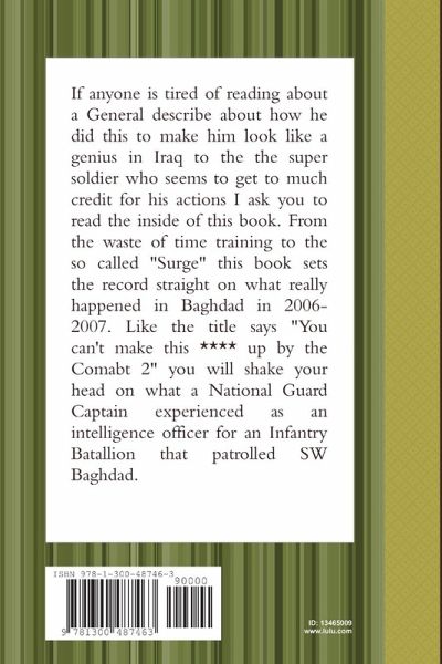 As the intelligence officer for an infantry batallion that patrolled SW Baghdad in 2006-2007 or during the "Surge" I had special insight in how the war was really run. You will laugh out loud at times and at other times you will shake your head, but after reading this you will agree that "You can't make this **** up by the Comabt 2" is true.