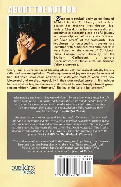 Born into a musical family on the island of Trinidad in the Caribbean, and with a passion for touching lives through dual ministry, Cheryl bares her soul as she shares a sometimes exasperating and painful journey in partnership, as reluctantly she is forced into "Solo Street" at the crossroads. Her headlamps for unsuspecting travelers are identified with humor and resilience. Her skills were honed on the campus of Caribbean Union College, (now University of the Southern Caribbean), a private denominational institution in the lush Maracas Valley countryside. Cheryl can always be found blessing others with her musical talents, literary skills and constant optimism. Continuing sources of joy are the performances of her 100 voice junior choir members of yesteryear, most of whom have now blossomed and excelled, especially in their own musical careers. This includes her son Chelton Jon, the founder and director of his own Brooklyn-based, gospel singing ministry, "Laos In Harmony". The joy of the Lord is her strength.