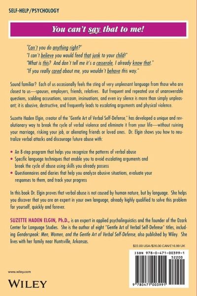 You can?t say that to me! "Can?t you do anything right?" "I can?t believe you would feed that junk to your child!" "What is this? And don?t tell me it?s a casserole, I already know that." "If you really cared about me, you wouldn?t behave this way." Sound familiar? Each of us occasionally feels the sting of very unpleasant language from those who are closest to us?spouses, employers, friends, relatives. But frequent and repeated use of unanswerable questions, scalding accusations, sarcasm, insinuations, and even icy silence is more than simply unpleasant; it is abusive, destructive, and frequently leads to escalating arguments and physical violence. Suzette Haden Elgin, creator of the "Gentle Art of Verbal Self-Defense," has developed a unique and revolutionary way to break the cycle of verbal violence and eliminate it from your life?without ruining your marriage, risking your job, or alienating friends or loved ones. Dr. Elgin shows you how to neutralize verbal attacks and discourage future abuse with: * An 8-step program that helps you recognize the patterns of verbal abuse * Specific language techniques that enable you to avoid escalating arguments and break the cycle of abuse using skills you already possess * Questionnaires and diaries that help you analyze abusive situations, evaluate your responses to them, and track your progress In this book Dr. Elgin proves that verbal abuse is not caused by human nature, but by language. She helps you discover that you are an expert in your own language, already highly qualified to solve this problem for yourself, quickly and forever.