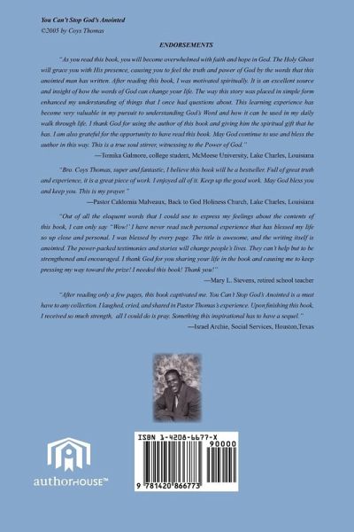 You Can't Stop God's Anointed is the story of God's calling, anointing, and direction in the life of a young man born in Welsh, Louisiana, in the 1950s. At the age of six, Lee Anna Thomas recognized that her son would someday be a minister. At fifteen, he had the first of many conversations with God about the purpose of his life. He made a vow to God. "I will go wherever you want me to go and say whatever you want me to say, but first I want to experience life to be able to understand your people through my experience. Once I have experienced life and become a man, I will do your will." In 1982 God showed Coys Thomas a vision of his ministry and purpose of calling, and then he received the Holy Ghost and was anointed for the ministry. An ordained pastor with twenty-two years of experience, Coys Thomas addresses some tough issues for Christians today including prophecy, being born again, leadership, witchcraft, oppression, persevering through trial, God's unconditional love, encamped about with angels, crossroads of decision, you can get healing from infertility, take back your neighborhood, holding onto a vision. His own personal life stories are interwoven in these important teachings.