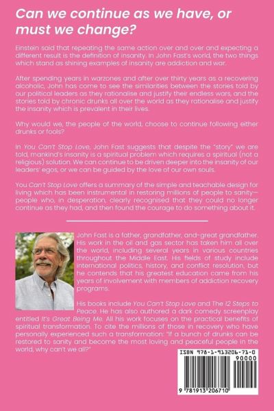 Can we continue as we have, or must we change?Einstein said that repeating the same action over and over and expecting a different result is the definition of insanity. In John Fast's world, the two things which stand as shining examples of insanity are addiction and war.After spending years in warzones and after over thirty years as a recovering alcoholic, John has come to see the similarities between the stories told by our political leaders as they rationalise and justify their endless wars, and the stories told by chronic drunks all over the world as they rationalise and justify the insanity which is prevalent in their lives.Why would we, the people of the world, choose to continue following either drunks or fools?In You Can't Stop Love, John Fast suggests that despite the "story" we are told, mankind's insanity is a spiritual problem which requires a spiritual (not a religious) solution. We can continue to be driven deeper into the insanity of our leaders' egos, or we can be guided by the love of our own souls.You Can't Stop Love offers a summary of the simple and teachable design for living which has been instrumental in restoring millions of people to sanity-people who, in desperation, clearly recognised that they could no longer continue as they had, and then found the courage to do something about it.