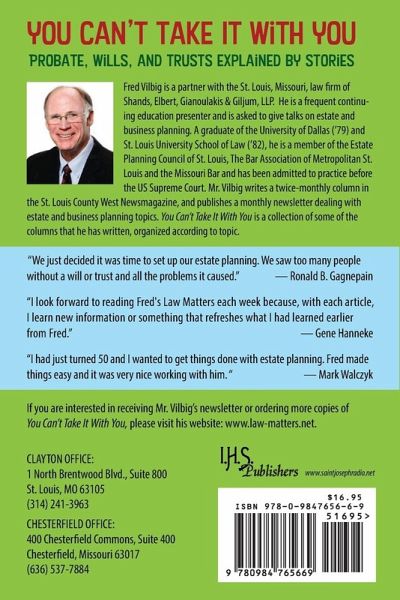You Can't Take It With You is a collection of stories taken from real life used to demonstrate estate and business planning in an approachable and understandable way. Over his 40 years of practicing law, Fred has encountered numerous instances that are at times humorous and at other times sad dealing with people trying to plan their estates. The book discusses forms of ownership, non-probate transfers such as pay-on-death clauses, what you can do with a will, and why you might want to consider a trust. It also discusses issues such as charitable planning, business planning, and planning with divorces and second marriages. It examines financial exploitation of the elderly and disabled. Finally, it examines special questions such as estate taxes, planning for family members with mental health issues, and Medicaid planning. It is a primer that will help you to get a basic understanding of the issues, although it is not a substitute for consulting an experienced attorney.