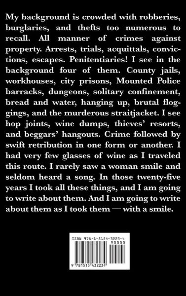 My background is crowded with robberies, burglaries, and thefts too numerous to recall. All manner of crimes against property. Arrests, trials, acquittals, convictions, escapes. Penitentiaries! I see in the background four of them. County jails, workhouses, city prisons, Mounted Police barracks, dungeons, solitary confinement, bread and water, hanging up, brutal floggings, and the murderous straitjacket. I see hop joints, wine dumps, thieves' resorts, and beggars' hangouts. Crime followed by swift retribution in one form or another. I had very few glasses of wine as I traveled this route. I rarely saw a woman smile and seldom heard a song. In those twenty-five years I took all these things, and I am going to write about them. And I am going to write about them as I took them - with a smile.