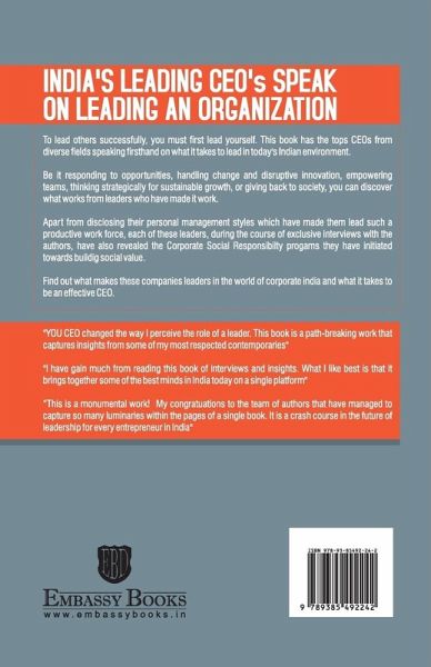 To lead others successfully , you must first lead yourself . This book presents incisive insights gathered through exclusive interviews with nine of India's leading CEOs. The many revelations made in each interview have been condensed into value statements and best practices which existing CEOs can use to become better leaders and aspiring CEOs can use to follow their vision. Featuring leading CEOs including : Nadir Godrej - Godrej Industries Subhash Chandra - Zee Entertainment Anu Aga - Thermax Dr Lalit Kumar Kanodia - Datamatics Ajay Piramal - Piramal Enterprises Ramesh Hira - Hira Industries Marten Pieters - Vodafone India Marten Kriegner - Lafarge India Pvt Ltd. Ayaz Memon - CEO Coach.