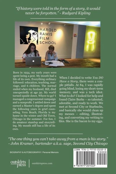 When I decided to write You DO Have a Story, there were a couple pitfalls. At 84, I was rapidly going blind, losing my short-term memory, and was a tech idiot. What to do? I looked for help and found Claire Burke - so talented, adorable, and ready to work. We met at Second City or Starbucks, and basically she would clean up my messes - editing, illustrating, and converting my writing to files. She is the bacon to my eggs.