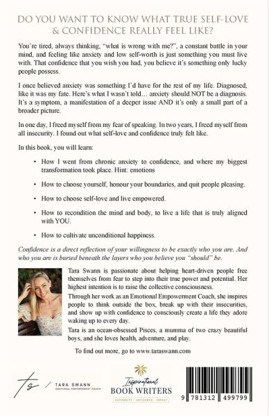 DO YOU WANT TO KNOW WHAT TRUE SELF-LOVE & CONFIDENCE REALLY FEEL LIKE? You're tired, always thinking, "what is wrong with me?", a constant battle in your mind, and feeling like anxiety and low self-worth is just something you must live with. That confidence that you wish you had, you believe it's something only lucky people possess. I once believed anxiety was something I'd have for the rest of my life. Diagnosed, like it was my fate. Here's what I wasn't told... anxiety should NOT be a diagnosis. It's a symptom, a manifestation of a deeper issue AND it's only a small part of a broader picture. In one day, I freed myself from my fear of speaking. In two years, I freed myself from all insecurity. I found out what self-love and confidence truly felt like. In this book, you will learn: ¿ How I went from chronic anxiety to confidence, and where my biggest transformation took place. Hint: emotions ¿ How to choose yourself, honour your boundaries, and quit people pleasing. ¿ How to choose self-love and live empowered. ¿ How to recondition the mind and body, to live a life that is truly aligned with YOU. ¿ How to cultivate unconditional happiness. Confidence is a direct reflection of your willingness to be exactly who you are. And who you are is buried beneath the layers who you believe you "should" be. Tara Swann is passionate about helping heart-driven people free themselves from fear to step into their true power and potential. Her highest intention is to raise the collective consciousness. Through her work as an Emotional Empowerment Coach, she inspires people to think outside the box, break up with their insecurities, and show up with confidence to consciously create a life they adore waking up to every day. Tara is an ocean-obsessed Pisces, a mumma of two crazy beautiful boys, and she loves health, adventure, and play. To find out more, go to www.taraswann.com