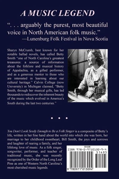 You Don't Look Seedy Enough to Be a Folk Singer is a composite of the life of Betty Nance Smith, written in her fine hand about the world into which she was born. The first half of her book portrays a simple world of buttermilk biscuits on a wood stove, soft feather beds and dimity quilts, a frosty wet ice box in summer, and household chores on her grandparents' farm. She writes of her parents' life of law enforcement, gardening, singing, and sewing during the Great Depression and the children's carefree world of games and school. She recounts her marriage to her childhood sweetheart, Bill Smith, the joys and sorrows and laughter of rearing a family, and her lifelong love of music. Betty devotes the last half of her book to her love of ballads, which she claims "have a richness of spirit not found in most commercial music. It is a reflection of how people lived, how they felt about life and living. We can feel the pain and sorrow, share in the joy, and laugh at the ridiculous. The themes in the stories and songs are universal. They have meaning for people today as they did two hundred years ago." As a folk singer, songwriter, performer, and teacher of traditional music, Betty was recently recognized by the Order of the Long Leaf Pine as one of Western North Carolina's most cherished music legends.