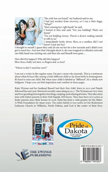 "She only has one hand; my husband said to me. I had just awoken from recovery, so I was a little foggy. "What?" "She's missing her right hand; he said. 1 I looked at him and said, "Are you kidding? That's not funny." "I'm not kidding, honey. There's a doctor waiting outside to talk to us:' I immediately broke down. How, as a mother, did I not i know? I just saw her! I thought to myself. I guess they only let me see her for a few seconds and I didn't even get to touch her. And now that I thought about it, she was wrapped in a blanket and only one little hand was sticking out, and then she and Russell were gone... How did this happen? Why did this happen? How does a baby not have io fingers and io toes? "Where is she? I need her now!" I am not a writer in the regular sense, I'm just a mom who journals. This is a testimony about what it's been like raising a limb-different child so far, from birth to kindergarten. It's hard to raise any child. But when your child is labeled as "different", it's a whole new ballgame. I hope you can find inspiration and comfort in these pages. Katie Wyman and her husband Russell had their first child, Jeten in 2010 and Paisely followed the next year. Maverick recently came along in 2017. The Wymans are very close and love spending time together traveling, camping, and relaxing at home. They also enjoy time with Katie's parents in their Park Rapids, MN home. They have been very active as foster parents since their license in zo 1.6. Katie has been a wish granter for the Make-A-Wish Foundation for many years. The entire family is very active in Our Redeemers Lutheran Church in Williston, North Dakota, and God is the center of their lives.