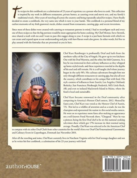 The recipes in this cookbook are a culmination of 23 years of experience as a person who loves to cook. This collection is inspired by my work in different restaurants, private homes, at catering event and movie sets, and my family's traditional meals. After years of traveling all across the country and being repeatedly asked for recipes, I have finally decided to create a cookbook, the very same one which is now in your hands. This cookbook is a personal blend of my earliest memories of my Irish gramma's meals, dishes created from restaurants, catering gigs, and recent inventions. Since most of these dishes were created with catering or restaurant patrons in mind, I had to reconfigure each and every one of these recipes so that the big portions would be more appropriate for home cooking. My Chef Mentor, Steve Smrstik, once shared a truth with me and I want to pass this nugget along to you: A recipe is a just basic formula with which we can create and expand upon as our understanding and play with how flavors work also grows. In other words, feel free to play around with the formulas that are presented to you in here.