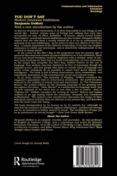 In this era of political correctness, it is often impossible to say things as one would like. Indeed, certain ways of feeling and talking that were once acceptable are now, in effect, forbidden. Of course, taboos extend further than speech. Social and sexual inhibitions are also evident. Benjamin DeMott argues that the very least a society should do is to try to understand the meaning of its own inhibitions. As he writes in this new edition of You Don't Say, "a supple awareness of the effective censorship of the day can toughen resistance to clich and stereotype, and is absolutely indispensable to the survival of sharp minds." At the center of You Don't Say is the proposition that the present age of personal liberation has created as many inhibitions as it has abolished. Some of our new-found freedoms could be employed with a sharper sense of tact. And some freedoms we have lost are worth remembering-or even recovering. In the essays that comprise You Don't Say DeMott reflects on the use of language, how modern man has claimed to be free of repression though the opposite is true, and how people who object to certain types of language and prefer verbal ambiguity do so possibly to assert their moral dignity and intelligence. The book is full of sharp observations, witty commentary, and empathetic description of the contemporary social and cultural scene. In an essay entitled "The Anatomy of Playboy," DeMott correlates the magazine's popularity with its reductionist tendencies: the world becomes reduced to the realities of sexual need and deprivation. In "The Passionate Mutes," the author reflects on the changing language of the greeting card throughout the years. "Dirty Words?" is a meditation on language itself, and on how mastery of the word was at one time a key to power. And in "Oyiemu-O?" DeMott considers the writing of "native" African and Indian authors in an age during which the colonialist viewpoint was considered authoritative. The author's new introduction discusses the essays in their historical context and how they are relevant to the present day, and describes how the book came into being. "[A] book distinguished by its beauty as by its wisdom for-although we may feel the pressure of inhibition against admitting it-intellectual courage can be as beautiful as bodies swayed to music. The intelligence of hope can be as passionate as sexual hunger."-New York Times Book Review Benjamin DeMott is an essayist, novelist, and journalist. He was professor of English at Amherst College, and a consultant and writer for National Education Television. He is the author of The Body's Cage, Hells & Benefits, a collection of essays, and Killer Woman Blues: Why Americans Can't Think Straight About Gender and Power.