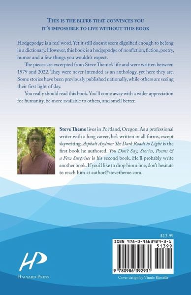 Hodgepodge is a real word. Yet it still doesn't seem dignified enough to belong in a dictionary. However, this book is a hodgepodge of nonfiction, fiction, poetry, humor, horror and a few things you wouldn't expect. The pieces are excerpted from Steve Theme's life and were written between 1979 and 2022. They were never intended as an anthology, yet here they are. Some stories have been previously published nationally, while others are seeing their first light of day. You really should read this book. You'll come away with a wider appreciation for humanity, be more available to others, and smell better.