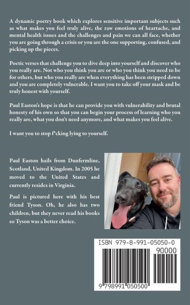 A dynamic poetry book which explores sensitive important subjects such as what makes you feel truly alive, the raw emotions of heartache, and mental health issues and the challenges and pain we can all face, whether you are going through a crisis or you are the one supporting, confused, and picking up the pieces. Poetic verses that challenge you to dive deep into yourself and discover who you really are. Not who you think you are or who you think you need to be for others, but who you really are when everything has been stripped down and you are completely vulnerable. I want you to take off your mask and be truly honest with yourself. Paul Easton's hope is that he can provide you with vulnerability and brutal honesty of his own so that you can begin your process of learning who you really are, what you don't need anymore, and what makes you feel alive. I want you to stop f*cking lying to yourself.