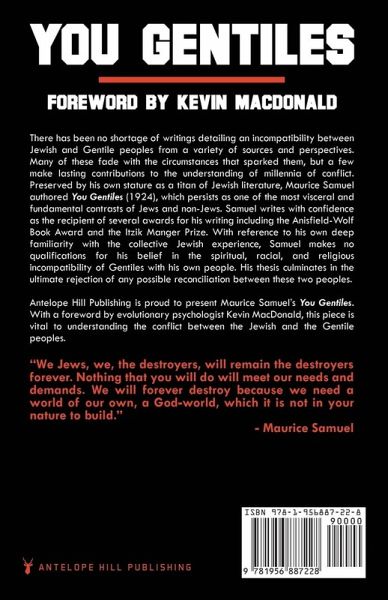 "We Jews, we, the destroyers, will remain the destroyers forever. Nothing that you will do will meet our needs and demands. We will forever destroy because we need a world of our own, a God-world, which it is not in your nature to build." Maurice Samuel There has been no shortage of writings detailing an incompatibility between Jewish and Gentile peoples from a variety of sources and perspectives. Many of these fade with the circumstances that sparked them, but a few make lasting contributions to the understanding of millennia of conflict. Preserved by his own stature as a titan of Jewish literature, Maurice Samuel authored You Gentiles (1924), which persists as one of the most visceral and fundamental contrasts of Jews and non-Jews. Samuel writes with confidence as the recipient of several awards for his writing including the Anisfield-Wolf Book Award and the Itzik Manger Prize. With reference to his own deep familiarity with the collective Jewish experience, Samuel makes no qualifications for his belief in the spiritual, racial, and religious incompatibility of Gentiles with his own people. His thesis culminates in the ultimate rejection of any possible reconciliation between these two peoples. Antelope Hill Publishing is proud to present Maurice Samuel's You Gentiles. With a foreword by evolutionary psychologist Kevin MacDonald, this piece is vital to understanding the conflict between the Jewish and the Gentile peoples.