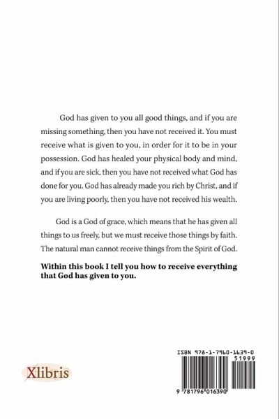 You got it because you received it. If you are missing something good, it's not God's fault. God has given you all good things, but if you are missing something, then you have not received it. You must receive what is given to you in order for it to be in your possession. God has healed your physical body and mind, but if you are sick, then you have not received what God has done for you. God has already made you rich by Christ, but if you are living poorly, then you have not received his wealth. God is a god of grace, which means that he has given all things to us freely, but we must receive those things by faith. The natural man cannot receive things from the Spirit of God. Within this book, I tell you how to receive everything that God has given to you.
