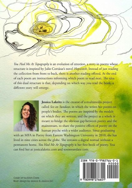 You Had Me At Topography is an evolution of emotion, a story in poems whose structure is inspired by Julio Cortazar's novel Hopscotch. Instead of just reading the collection from front to back, there is another reading offered. At the end of each poem are instructions informing which poem to read next. The idea of this dual structure is that, depending on which way you read the book, a different story will emerge.