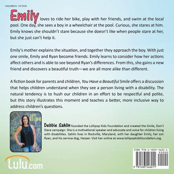 Emily loves to ride her bike, play with her friends, and swim at the local pool. One day, she sees a boy in a wheelchair at the pool. Curious, she stares at him. Emily knows she shouldn't stare because she doesn't like when people stare at her, but she just can't help it. Emily's mother explains the situation, and together they approach the boy. With just one smile, Emily and Ryan become friends. Emily learns to consider how her actions affect others and is able to see beyond Ryan's differences. From this, she gains a new friend and discovers a beautiful truth-we are all more alike than different. A fiction book for parents and children, You Have a Beautiful Smile offers a discussion that helps children understand when they see a person living with a disability. The natural tendency is to hush our children in an effort to be respectful and polite, but this story illustrates this moment and teaches a better, more inclusive way to address children's questions.
