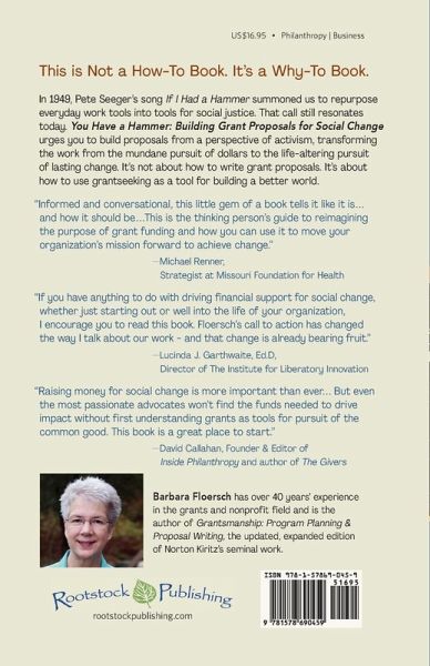 In 1949, Pete Seeger's song If I Had a Hammer summoned us to repurpose everyday work tools into tools for social justice. That call still resonates today. You Have a Hammer: Building Grant Proposals for Social Change urges you to build proposals from a perspective of activism, transforming the work from the mundane pursuit of dollars to the life-altering pursuit of lasting change. It's not about how to write grant proposals. It's about how to use grantseeking as a tool for building a better world.