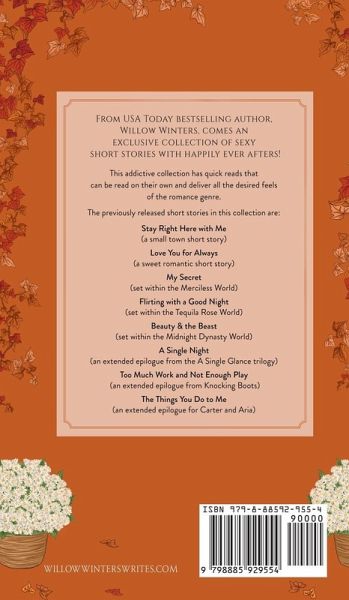 From USA Today bestselling author, Willow Winters, comes an exclusive collection of sexy short stories with happily ever afters! This addictive collection has quick reads that can be read on their own and deliver all the desired feels of the romance genre. The previously released short stories in this collection are: Stay Right Here with Me (a small town short story) Love You for Always (a sweet romantic short story) My Secret (set within the Merciless World) Flirting with a Good Night. (set within the Tequila Rose World) Beauty & the Beast (set within the Midnight Dynasty World) A Single Night (an extended epilogue from the A Single Glance trilogy) Too Much Work and Not Enough Play (an extended epilogue from Knocking Boots) The Things You Do to Me (an extended epilogue for Carter and Aria)