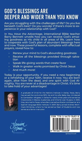 God's Blessings Are Deeper and Wider Than You Know Are you struggling with the challenges of life? Do you live beneath God's best? Do you wonder if there's more to experience in your relationship with God? In You Have the Advantage, international Bible teacher Barry Bennett unveils how you can receive God's amazing goodness as His child in all areas of life. Learn how to cooperate with God's plan of abundant blessings here and now. These powerful lessons, complete with effectual prayers, reveal how to: Renew your mind to God's abounding goodness Receive all the blessings provided through salvation Speak life-giving words that create favor Walk in greater works promised by Christ Jesus And much more! Today is your opportunity. If you need a new beginning or a refreshing of your faith, receive it now. You are born again, alive from the dead, and one spirit with God Almighty. You are never at a disadvantage in Christ. It's time to take hold of your advantages!