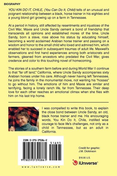 YOU KIN DO IT, CHILE, (You Can Do It, Child) tells of an unusual and poignant relationship between a black, horse trainer in his eighties and a young blond girl growing up on a farm in Tennessee. At a period in history, still affected by resentments and injustices of the Civil War, Maxie and Uncle Sandy cement a bond of friendship that transcends all opinions and established mores of the time. Uncle Sandy, born a slave, rose above his status by educating himself, becoming a world acclaimed Arabian horse trainer and passing on a wisdom and honor to the small child who loved and admired him, which enabled her to succeed in subsequent traumas of adult life. Maxwell's observations and first hand experiences among both aristocrats and farmers, gleaned from ancestors who predated the Civil War, gives credence and color to this touching novel of homecoming. The stories of a southern farm before and during World War II continue to that "far off land," California, where Uncle Sandy accompanies sixty Arabian hosses under his care. Although never having left Tennessee, he joins the family in the monumental move, not wanting his "horses" to go without him. The emotions of him and Maxie are similar and terrifying, facing a lonely ranch life, far from Tennessee. Their deep love for each other reaches an emotional climax when she flies with him on his last trip home.