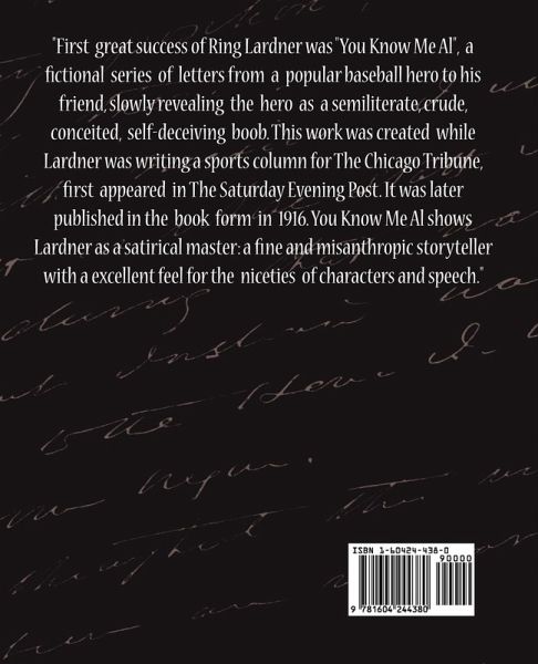 First great success of Ring Lardner was "You Know Me Al", a fictional series of letters from a popular baseball hero to his friend, slowly revealing the hero as a semiliterate, crude, conceited, self-deceiving boob. This work was created while Lardner was writing a sports column for The Chicago Tribune, first appeared in The Saturday Evening Post. It was later published in the book form in 1916. You Know Me Al shows Lardner as a satirical master: a fine and misanthropic storyteller with a excellent feel for the niceties of characters and speech.