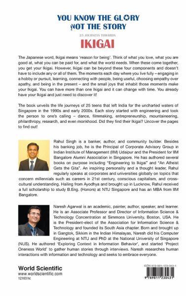The Japanese word, Ikigai means 'reason for being'. Think of what you love, what you are good at, what you can be paid for, and what the world needs. When these come together, you get your Ikigai. However, Ikigai can be beyond these four components and doesn't have to include any or all of them. The moments each day where you live fully - engaging in a hobby or pursuit, learning, connecting with people, being useful, choosing empathy over apathy, and being in the present - and the small joys that inhabit those moments make your Ikigai. You can have more than one Ikigai and it can change with time. You already have your Ikigai and just need to discover it! The book unveils the life journeys of 25 teens that left India for the uncharted waters of Singapore in the 1990s and early 2000s. Each story started with engineering and took the person to one's calling - dance, filmmaking, entrepreneurship, mountaineering, philanthropy, research, and even monkhood. Did they find their Ikigai? Uncover the pages to find out!